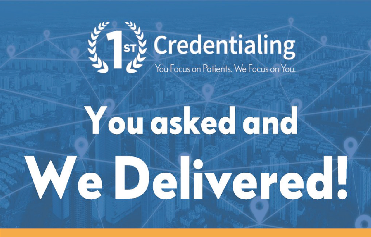 Call us at (512) 201-2668 or email us at Info@1stCredentialing.com